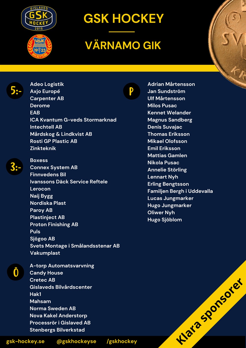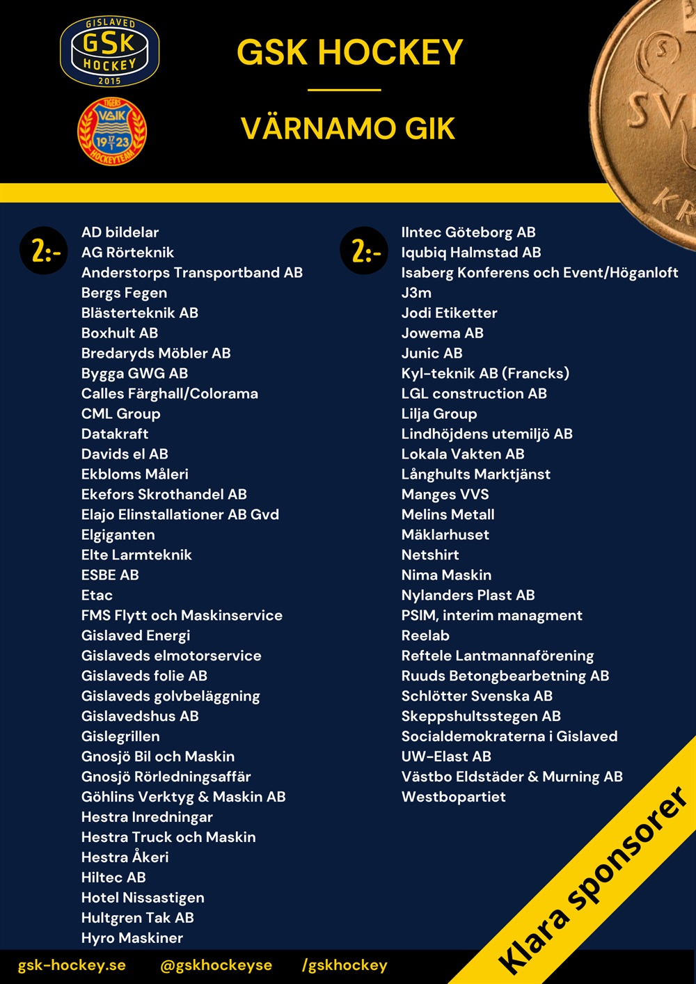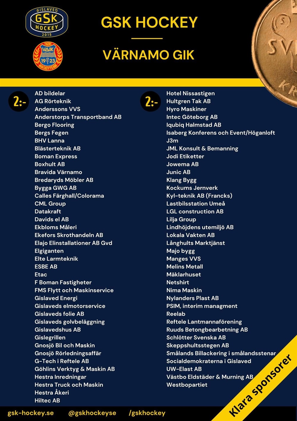 Har ni kontakt med företag som vill delta på 2-kronorsmatchen, eller om ni vill hjälpa till att ringa runt så kontakta marknadsgruppen genom catrin.soderstrom@gsk-hockey.se