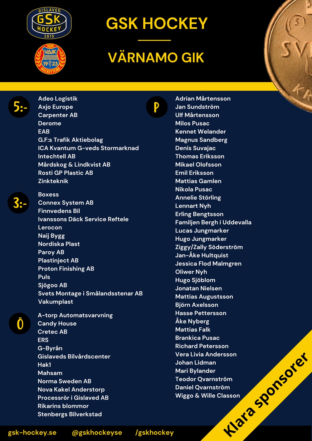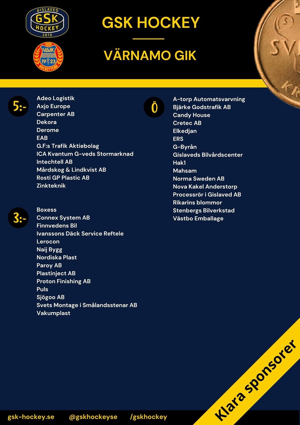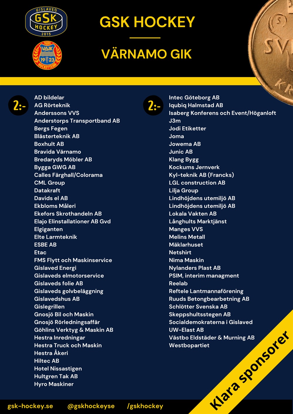 Har ni kontakt med företag som vill delta på 2-kronorsmatchen, eller om ni vill hjälpa till att ringa runt så kontakta marknadsgruppen genom catrin.soderstrom@gsk-hockey.se