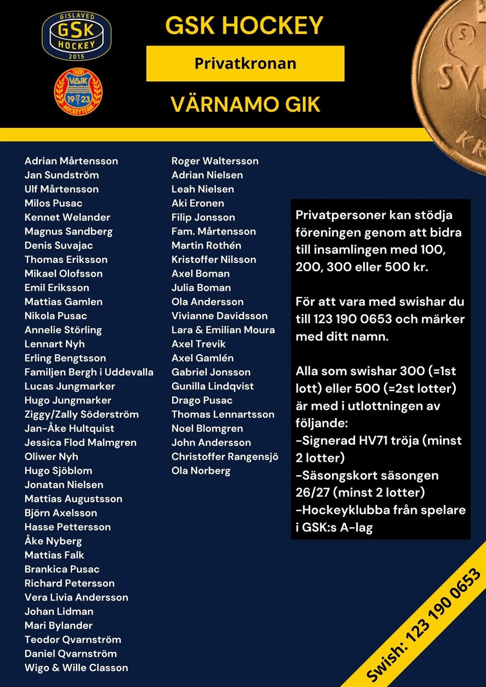Nu närmar vi oss säsongens "2-kronorsmatch" och initiativet "Privatkronan" som ger företag och privatpersoner möjlighet att bidra till GSK Hockey.