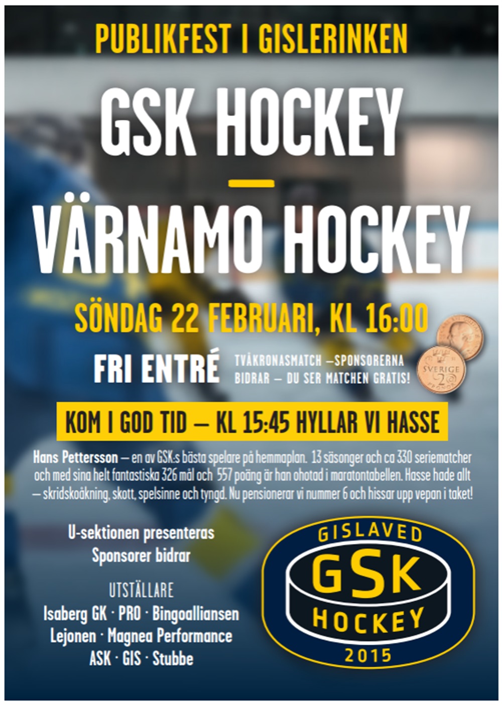 Innan matchstart kommer vi att hylla en av våra GSK legendarer- HASSE Petersson som spelade hela 330 matcher, gjorde 557 poäng och kan med det titulera sig som GSK's bästa poänggörare genom tiderna.